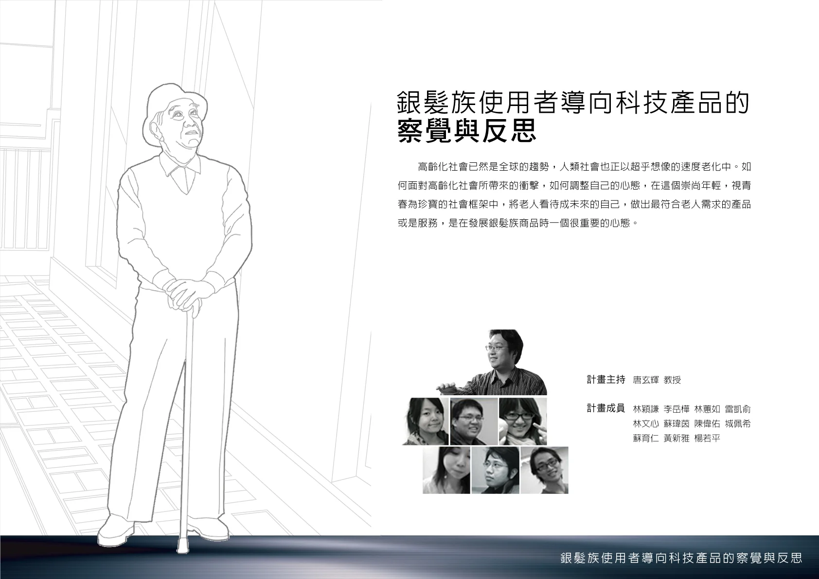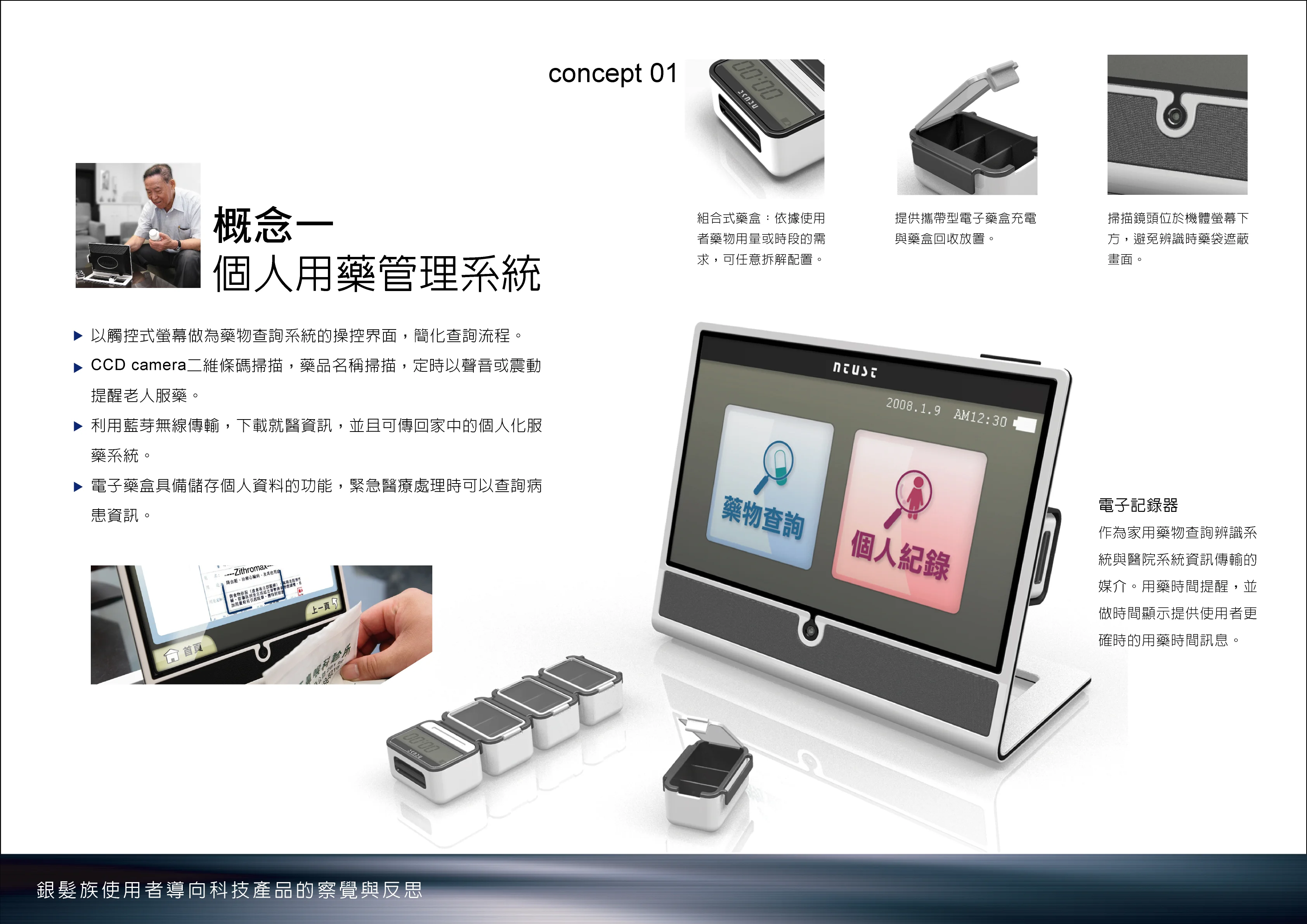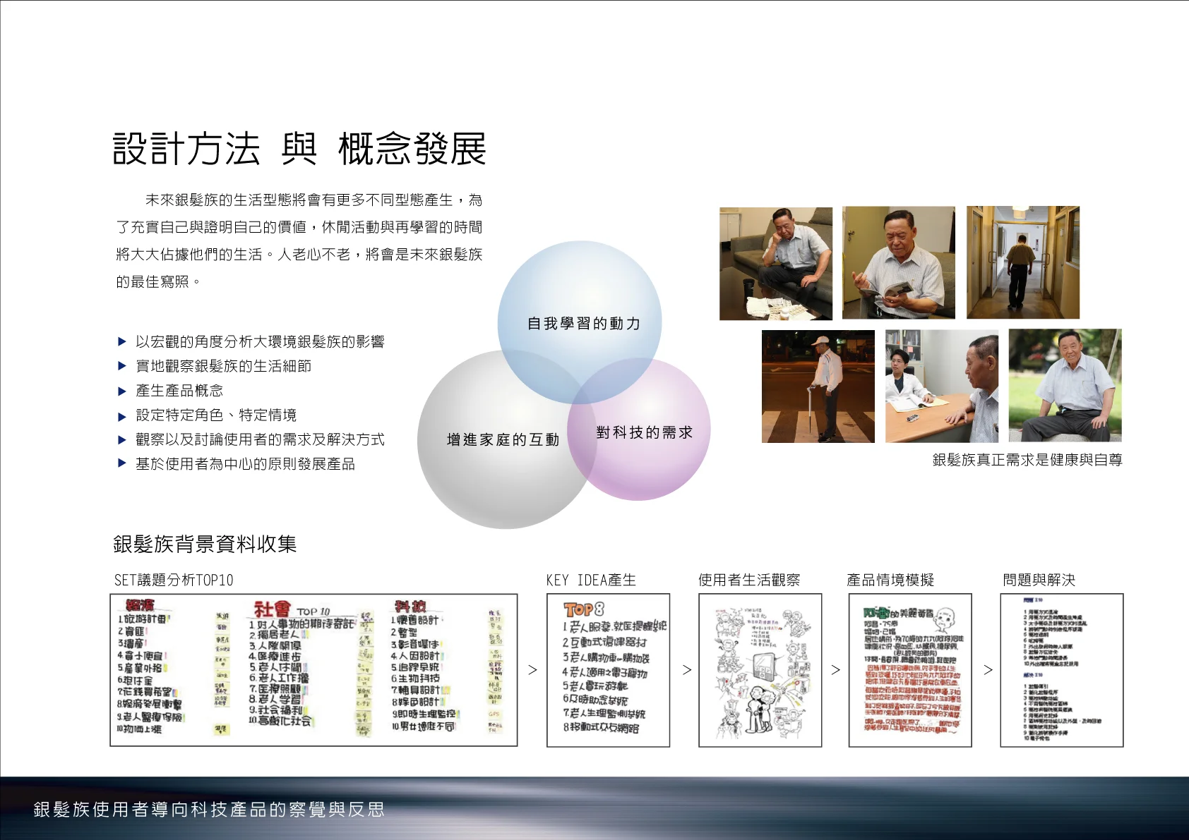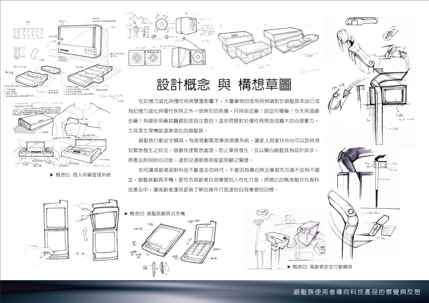 使用者為導向的設計是採用情境故事法作為設計方式,經由背景資料分析、小組成員腦力激盪、使用者觀察、問題的發現及解決、使用者及使用情境預想等過程,引導出設計概念,進而發展出符合使用者需求的產品。因應高齡化的社會趨勢,本次發表會的主題為銀髮族的產品設計。回應銀髮族在生活上的種種需求,尋求具開發潛力的市場。本次發表會的主題為:個人藥物管理系統以及複合式行動輔具。