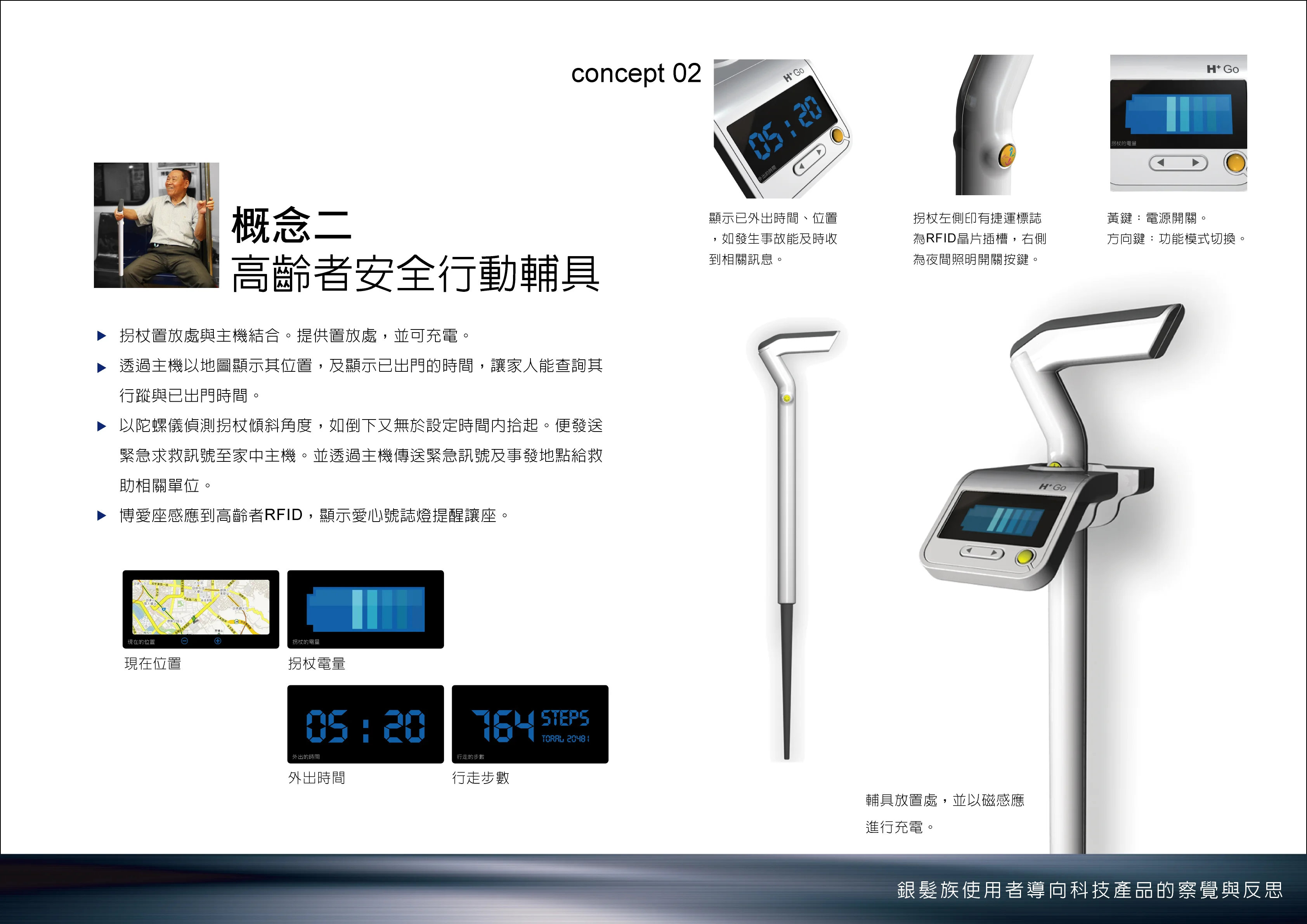 本產品係提升高齡者自信心與自我認同感的生活輔具。外觀為拐杖型態,主要複合RFID功能,於環境中與相關系統進行連結互動並提供服務,提升外出方便性與安全性。杖身可具照明功能以增加夜間活動安全性;可當作家中玄關的一盞明燈,家人也因它的存在提供了互動的橋樑。設計是有許多人一起做的,最後的MODEL與RENDER是雷凱俞。(最終設計尚未完成,近期內將上傳)