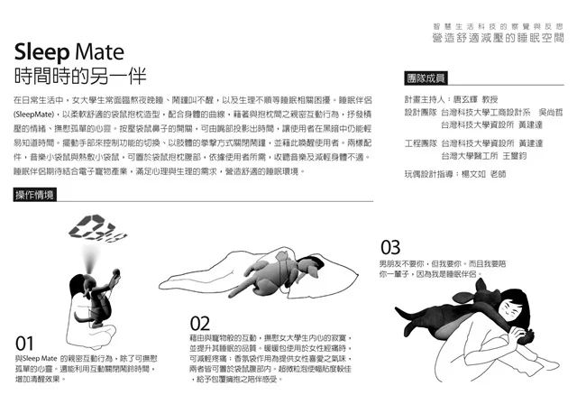 在日常生活中,女大學生常面臨熬夜晚睡、鬧鐘叫不醒,以及生理不順等睡眠相關困擾。睡眠伴侶(Sleep Mate),以柔軟舒適的袋鼠抱枕造型,配合身體的曲線,藉著與抱枕間之親密互動行為,抒發積壓的情緒、撫慰孤單的心靈。按壓袋鼠鼻子的開關,可由嘴部投影出時間,讓使用者在黑暗中仍能輕易知道時間。擺動手部來控制功能的切換、以肢體的拳擊方式關閉鬧鐘,並藉此喚醒使用者。兩樣配件,音樂小袋鼠與熱敷小袋鼠,可置於袋鼠抱枕腹部,依據使用者所需,收聽音樂及減輕身體不適。睡眠伴侶期待結合電子寵物產業,滿足心理與生理的需求,營造舒適的睡眠環境。