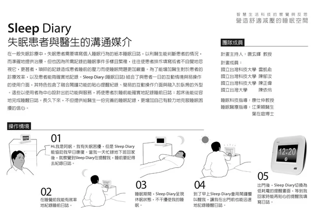 在一般失眠診療中,失眠患者需要填寫個人睡眠行為的紙本睡眠日誌,以利醫生能判斷患者的情況,而準確地提供治療。但也因為所需記錄的睡眠事件多樣且繁複,往往使患者排斥填寫或者不自覺地忽視它,更甚者,瑣碎的記錄造成患者睡前的壓力而使睡眠問題更加嚴重。為了能增加醫生對於患者的診療效率,以及患者能夠確實地記錄。Sleep Diary (睡眠日誌) 結合了與患者一日的互動情境與易操作的使用介面,其特色包含了融合鬧鐘功能的貼心提醒紀錄、簡易的互動操作介面與融入於臥房的外型。這些以使用者為中心設計出的功能與服務,將使患者於睡前能確實地記錄睡前日誌;起床後能從容地完成睡醒日誌。長久下來,不但提供給醫生一份完善的睡眠記錄,更增加自己有毅力地克服睡眠困擾的信心。
