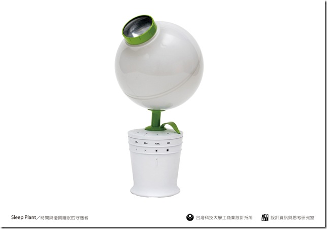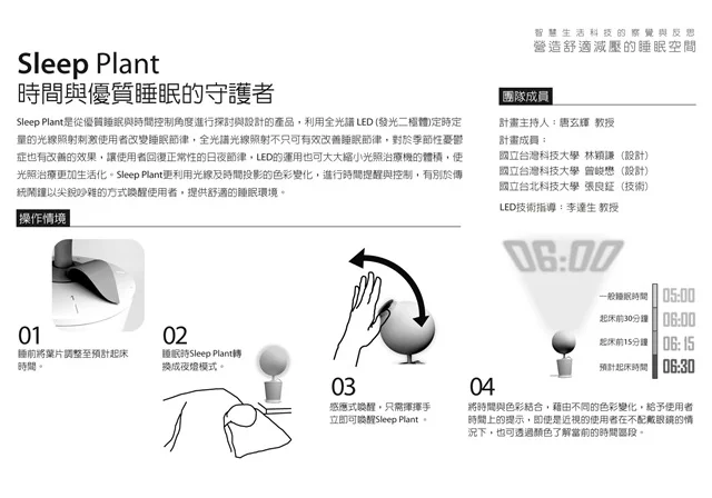睡眠植物(Sleep Plant)是從優質睡眠與時間控制角度進行探討與設計的產品,利用全光譜 LED (發光二極體)定時定量的光線照射刺激使用者改變睡眠節律,全光譜光線照射不只可有效改善睡眠節律,對於季節性憂鬱症也有改善的效果,讓使用者回復正常性的日夜節律,LED的運用也可大大縮小光照治療機的體積,使光照治療更加生活化。睡眠植物(Sleep Plant)更利用光線及時間投影的色彩變化,進行時間提醒與控制,有別於傳統鬧鐘以尖銳吵雜的方式喚醒使用者,提供舒適的睡眠環境。