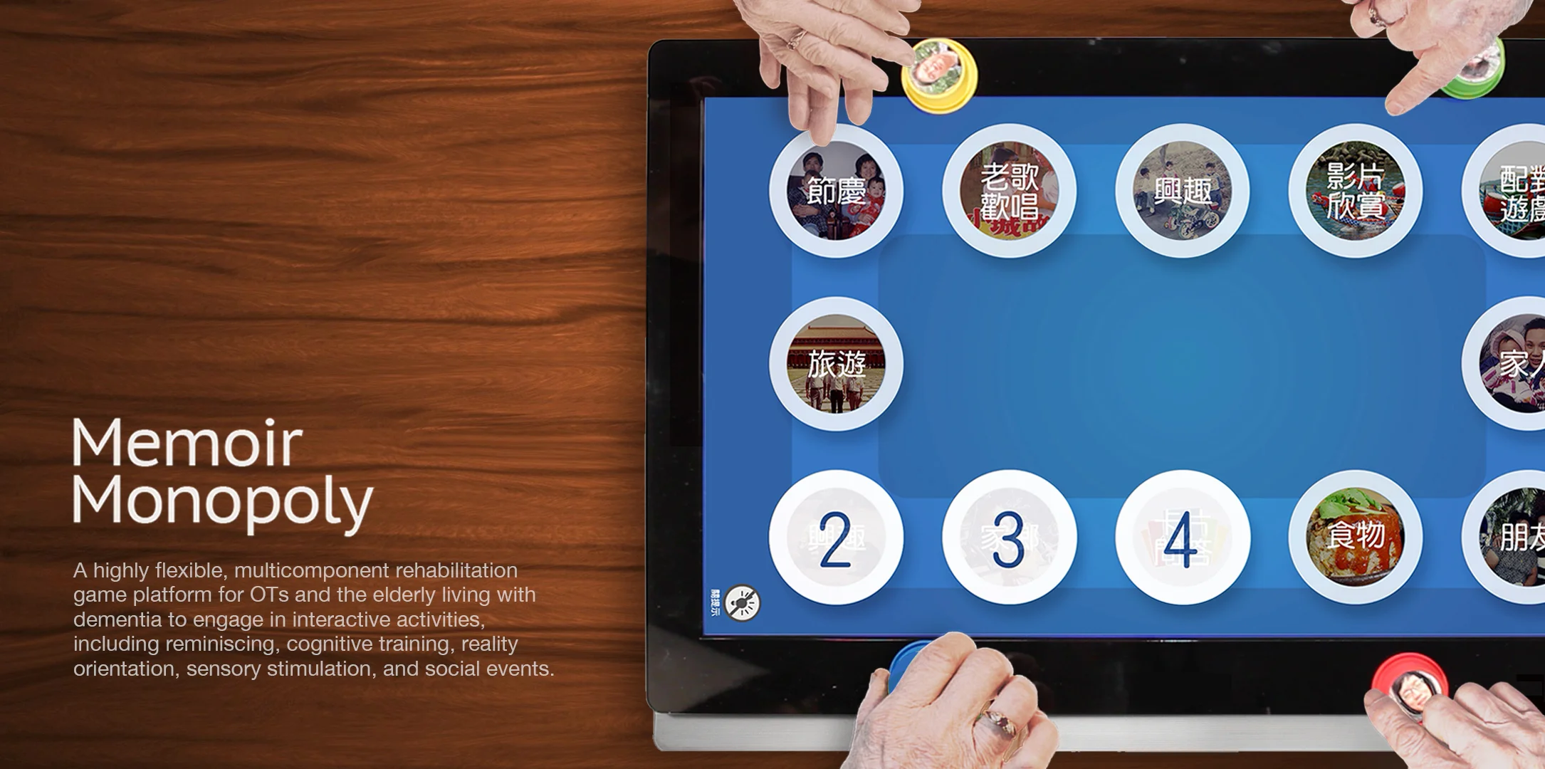 回憶錄大富翁遊戲是一個彈性、結合多元素材的客製化訓練遊戲軟體,能置入長輩熟悉的個人素材,透過職能治療師帶領長輩進行大富翁遊戲,包含:懷舊照片、影音欣賞、現實導向卡片問答、認知配對遊戲等,透過直覺的觸控方式讓長輩主動投入團體與活動中,藉由多元素材的刺激引起長輩興趣,提升參與度與深入程度;同時紀錄長輩活動成效並長期追蹤,掌握長者的復健進度與成果,帶給家屬與專業人員便利。