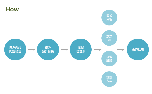 舉例來說,當自己在用戶端發現問題時,可以先假設設計的目標,同時向BI (business intelligence) 的同事索取相關的數據資料,在索取資料的階段,要秉持著契而不捨的精神,想辦法追到自己想掌握的數據,獲得數據資訊後便能整理所有的資訊脈絡,來檢視是否跟自己先前的假設吻合、或是設法修正,最後就能依照結果產出極具說服力的設計方案。這個過程就是用數據來驗證自己的設計方法,有效的對內部進行溝通,發揮設計師的影響力。