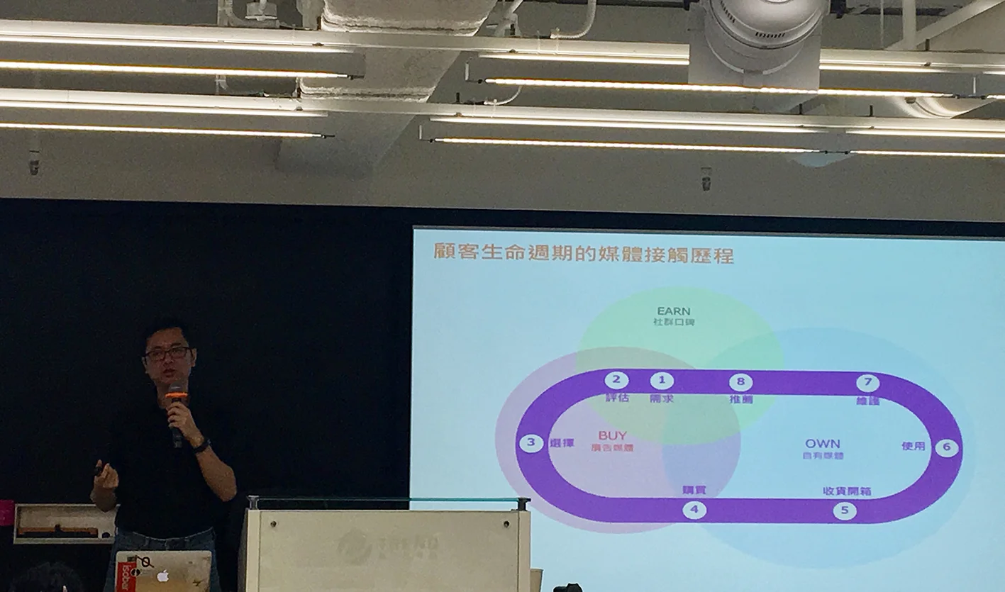 Charles從顧客生命週期循環歷程來解釋自有媒體(官網或門市)、購買媒體(付費廣告)及贏得的媒體(社群口碑)這三個行銷管道在其中發揮的作用。而當代行銷所面臨的挑戰,來自於人們隨時隨地利用零碎而長尾的時間使用數位螢幕媒體,且同時看電視、手機,螢幕媒體的重疊時間造成注意力的分散。
